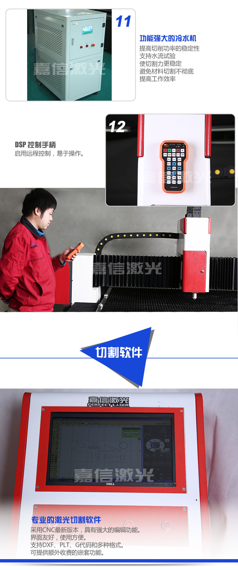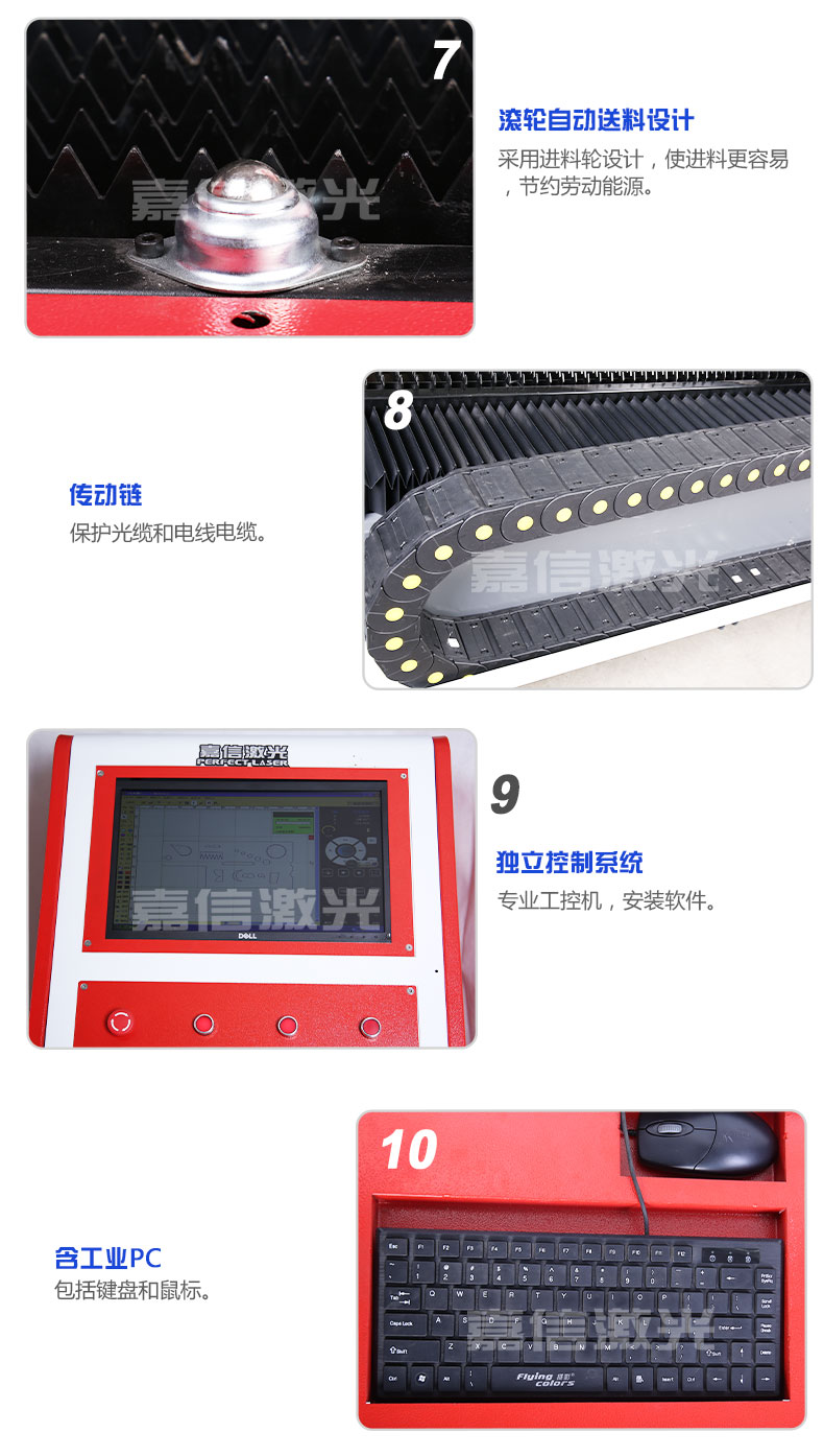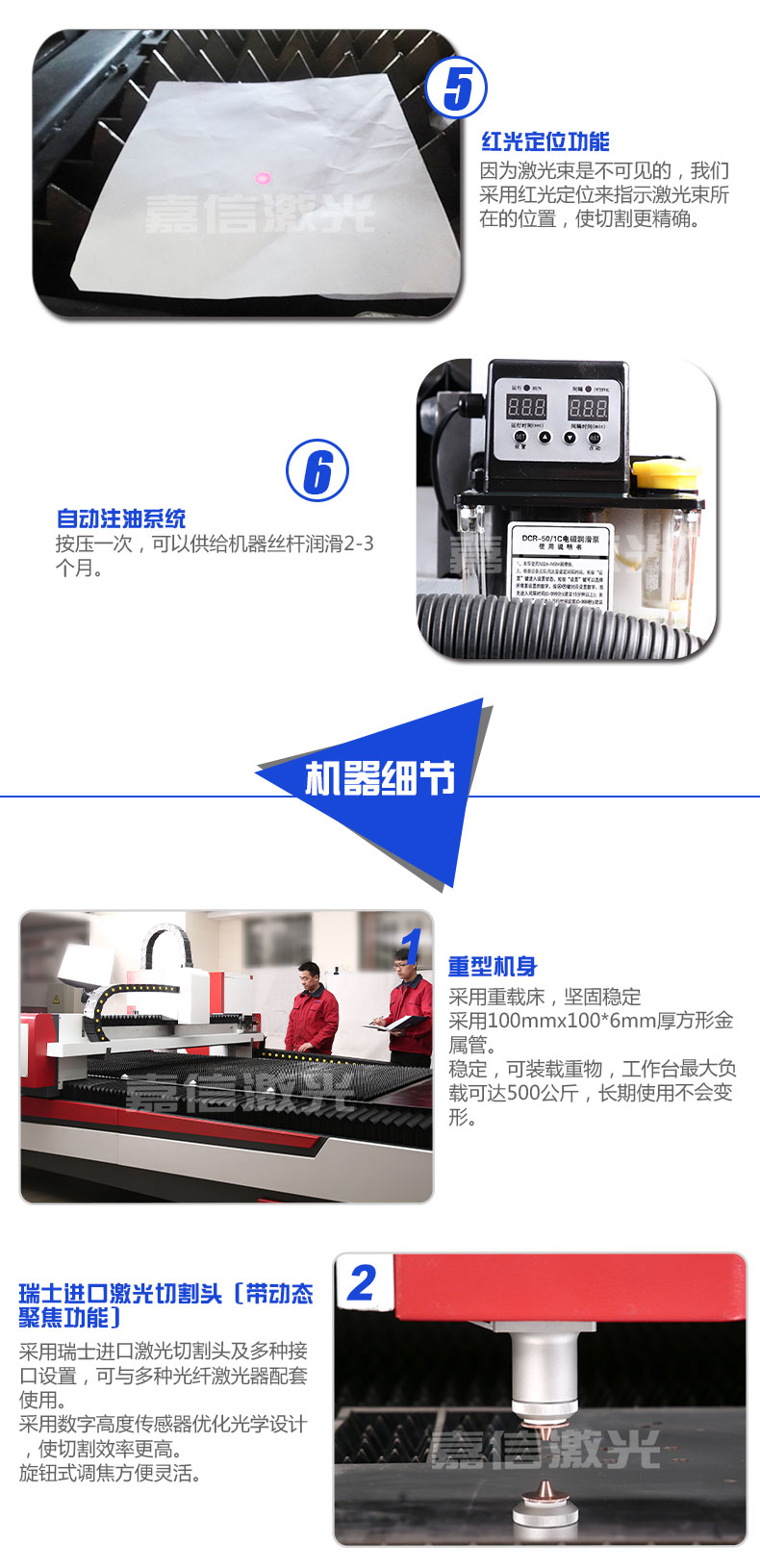1. 適用材(cái)料:500w光纖切割機主要對薄金屬板(bǎn)材(cái)的非接觸切割、3-5mm 不鏽鋼、4-6mm 碳鋼、鈦合金、鍍鋁鋅板(bǎn)、鍍(dù)鋅板、矽鋼、酸洗板等易(yì)碎合金材料板(bǎn)材。