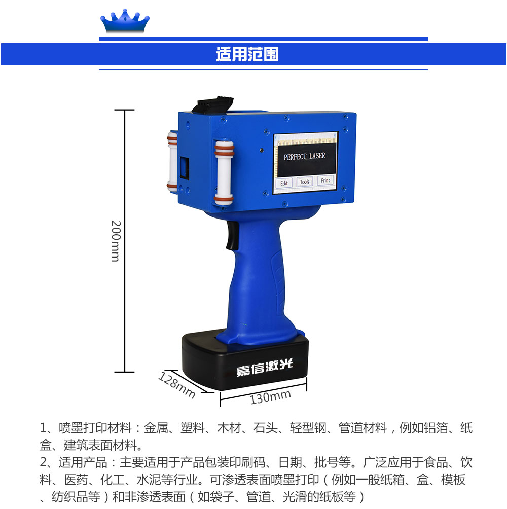 應用材(cái)料:金屬,塑料,木材,石材(cái),輕鋼,鋁箔,紙板箱及建築材(cái)料等管(guǎn)材(cái)。可滲透表麵(如普通紙箱,模板,紡織品等)和非滲透性表麵(如袋,管,光滑紙板等)的噴(pēn)墨打(dǎ)印。