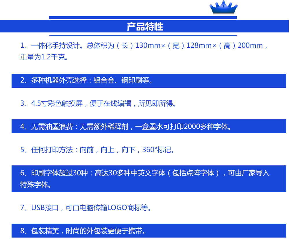 6. 30多種打印字體:高清中英文(wén)字(zì)體(包括點陣字體(tǐ)),可由製造商植入30多種特(tè)殊字體;