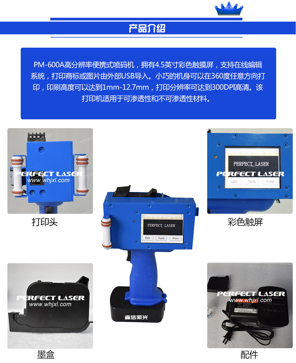為滿足(zú)客戶基本噴碼需求,91视频官网激光研製(zhì)出手持式高(gāo)解析噴碼機 PM-600A,此款機(jī)器除了一貫良好、穩定(dìng)的產品特性外,打印分辨(biàn)率和打印高度也有了明顯(xiǎn)提升,4.5英寸的彩色觸摸屏可連接外部USB導(dǎo)入圖片和商標(biāo)。應用行業也很廣泛,此款打印機特別適用於滲透或不滲透的材料。