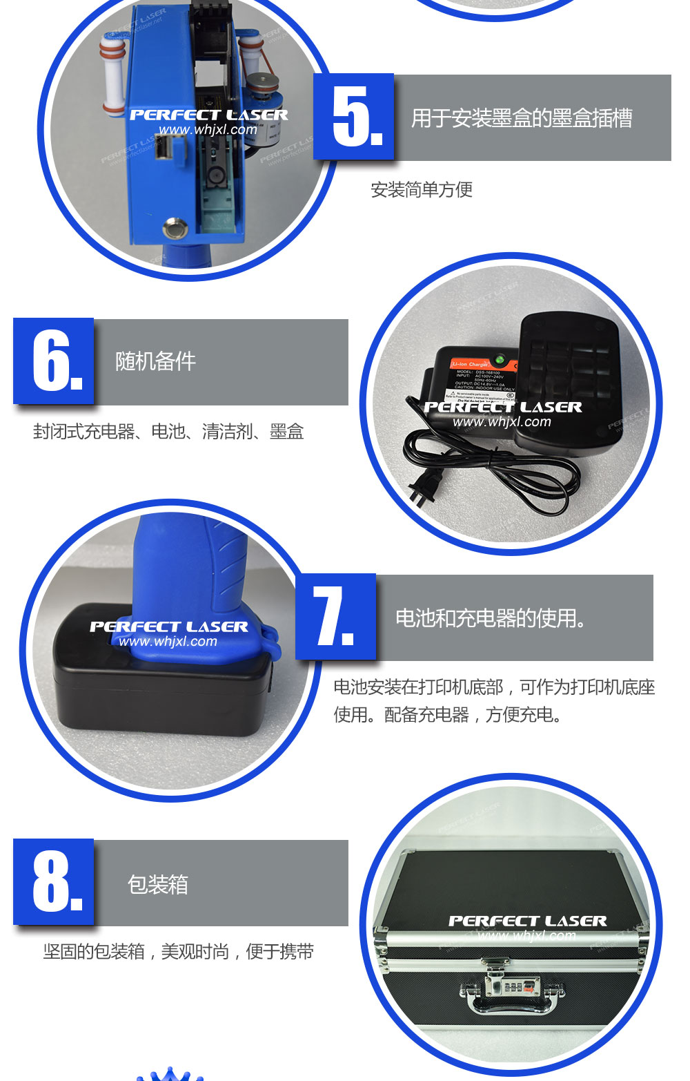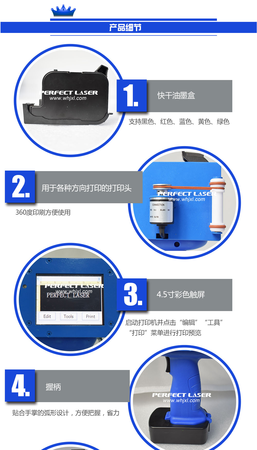 5.可朝任意方向打印:向前,向上,向下,360度標記;