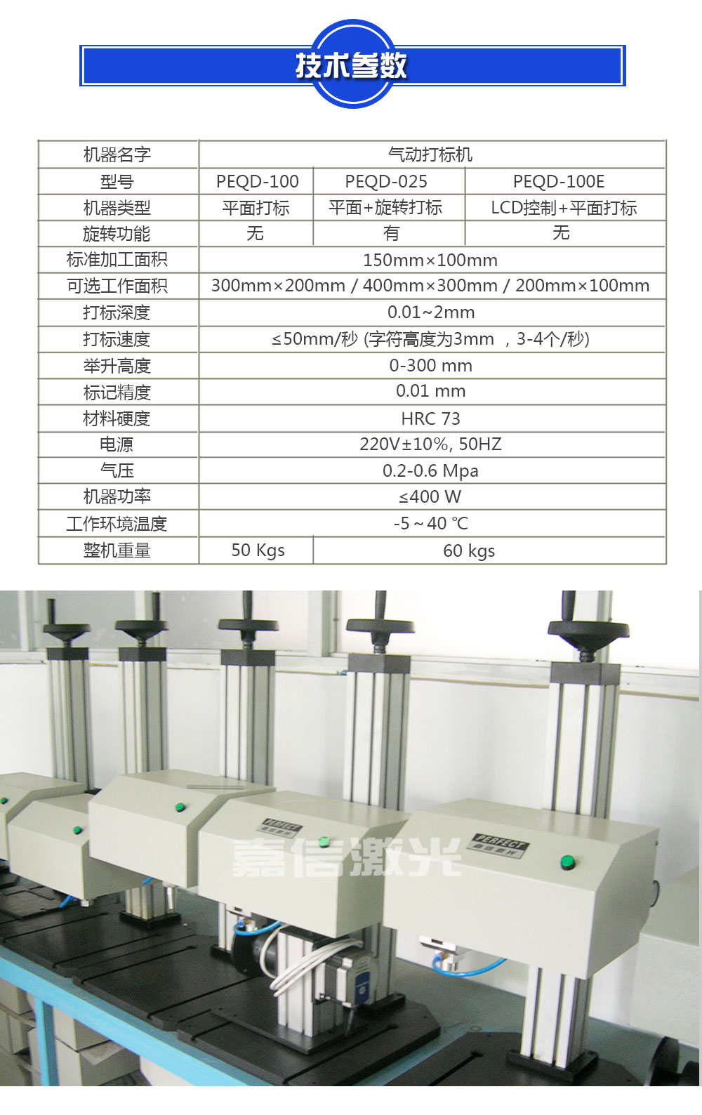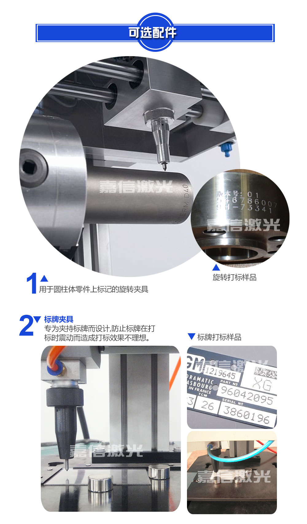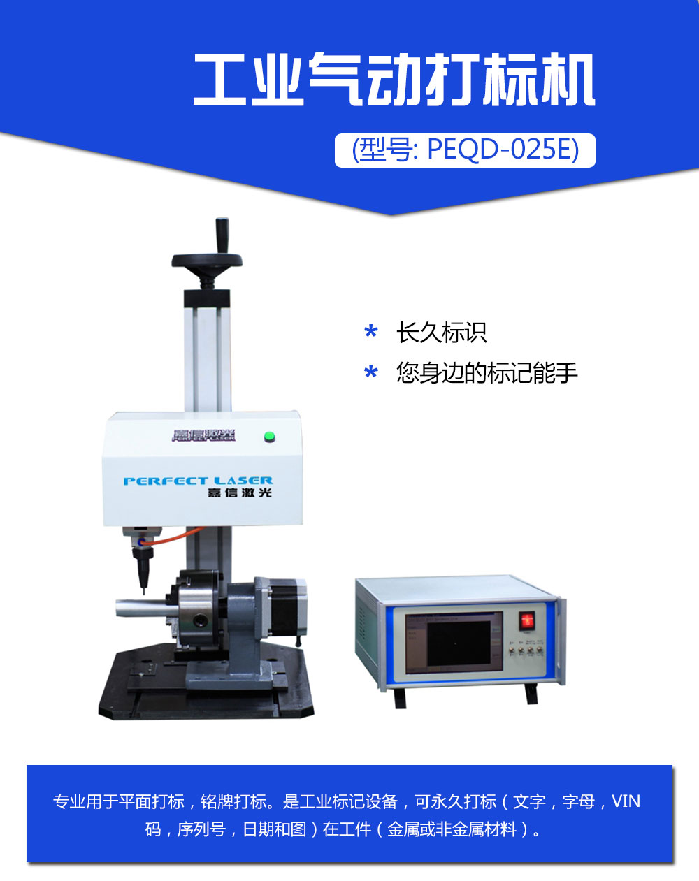 旋轉氣動打標機適合於各種(zhǒng)金屬或非金屬標牌、零(líng)部件的平麵打標、及圓柱形工件的軸向打標。用於汽車,摩托車,機械,航空,電氣設備上的各種金屬和硬塑料上的標記,例(lì)如:不鏽鋼,低(dī)碳鋼,鐵,鋁,銅,黃銅,及一些塗層(céng)材料。