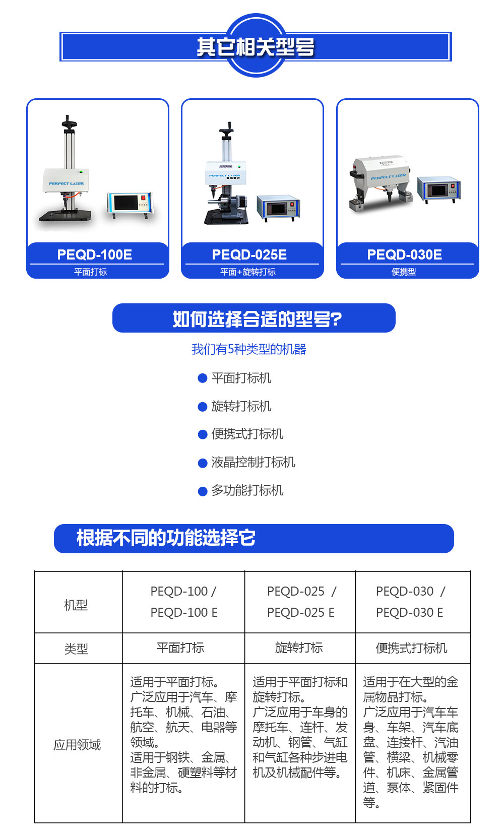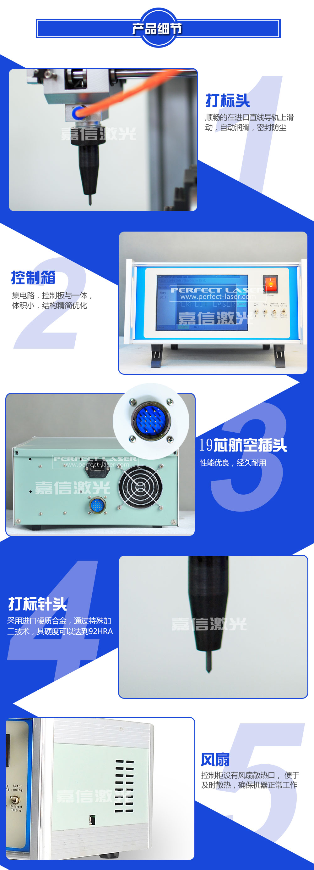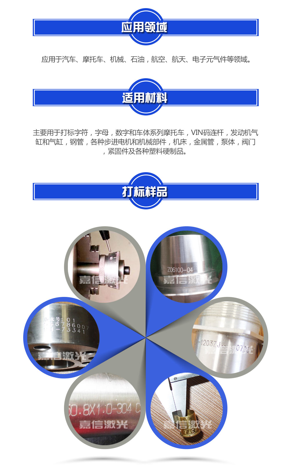 旋轉氣動打標機適合於各種(zhǒng)金屬或非金屬標牌、零(líng)部件的平麵打標、及圓柱形工件的軸向打標。用於汽車,摩托車,機械,航空,電氣設備上的各種金屬和硬塑料上的標記,例(lì)如:不鏽鋼,低(dī)碳鋼,鐵,鋁,銅,黃銅,及一些塗層(céng)材料。