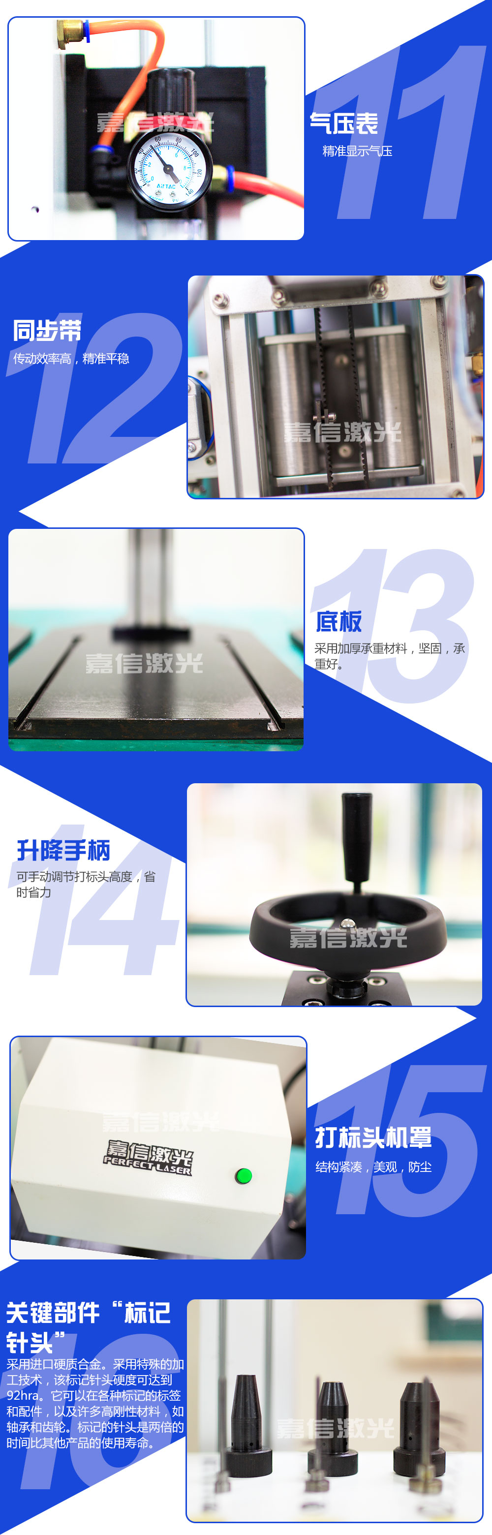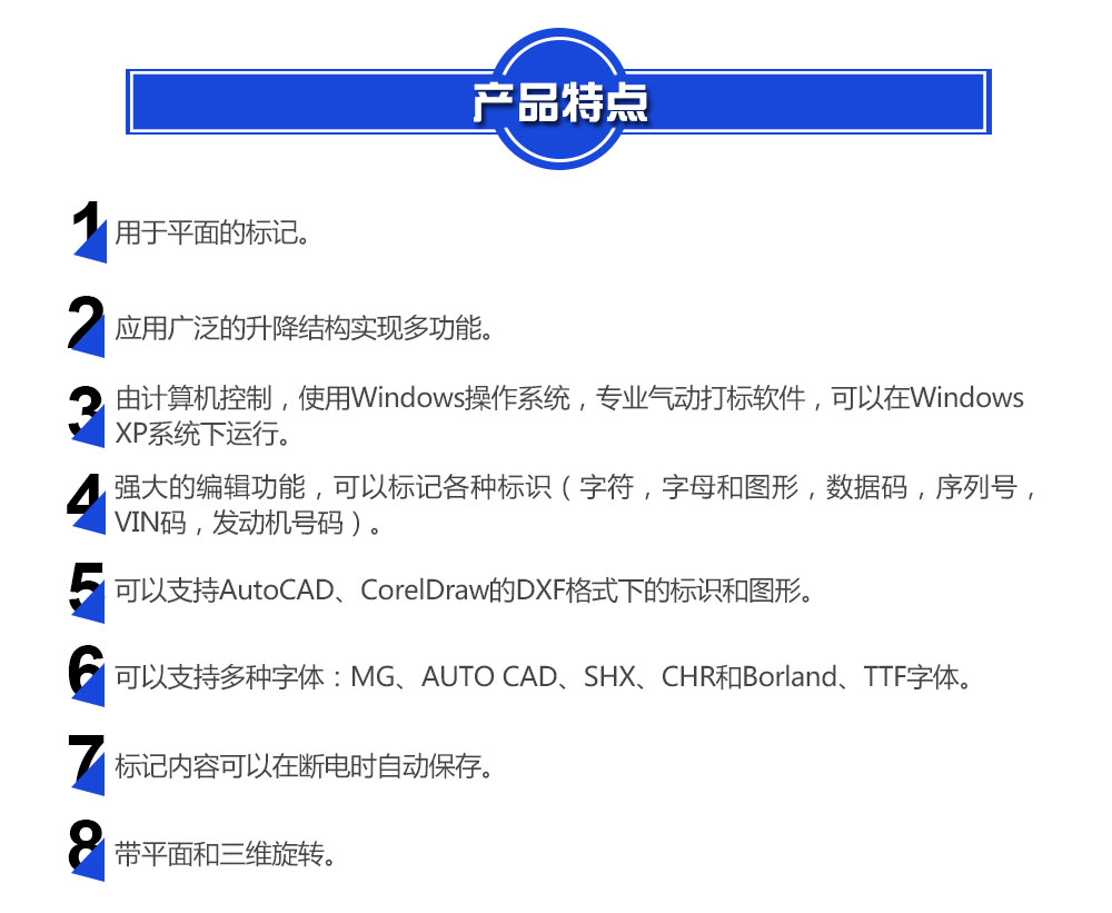 1. 旋轉氣動(dòng)打標機標記的字符大小(xiǎo)、間(jiān)距在幅麵(miàn)內可(kě)任意調節;