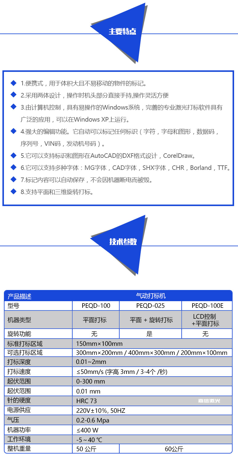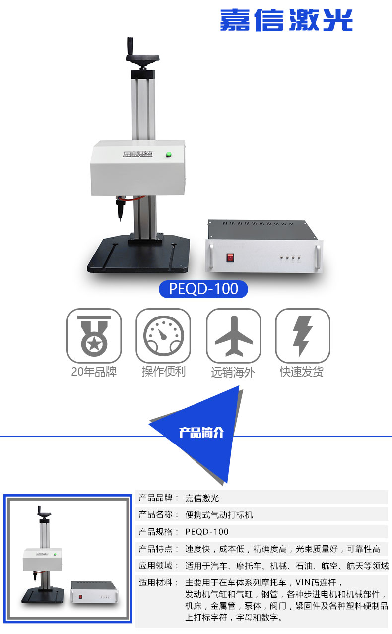 91视频官网激光(guāng)是集科研開發,生產銷售於一體的高新實體企業,經過多年的經營和開發(fā),工業氣動打標機PEQD-100可實現(xiàn)使圖案,文字,字母,VIN碼,序列號,日期和圖形等在工件上長久地標記,不可擦除(chú)。