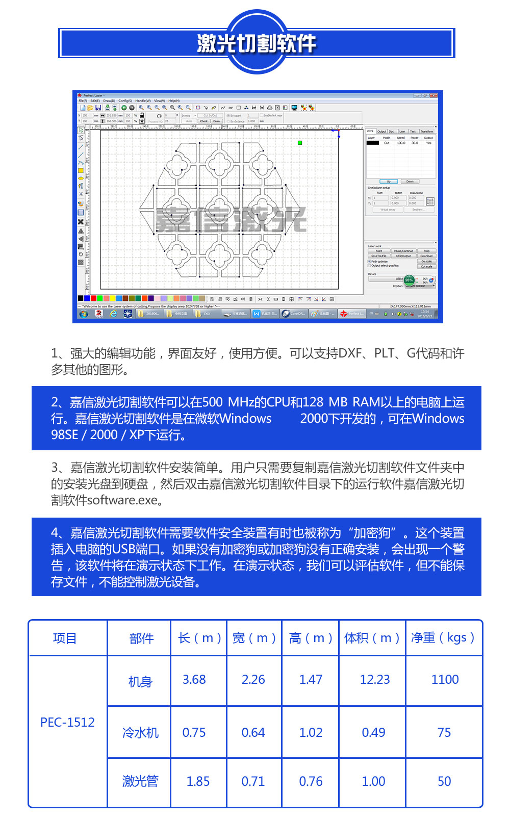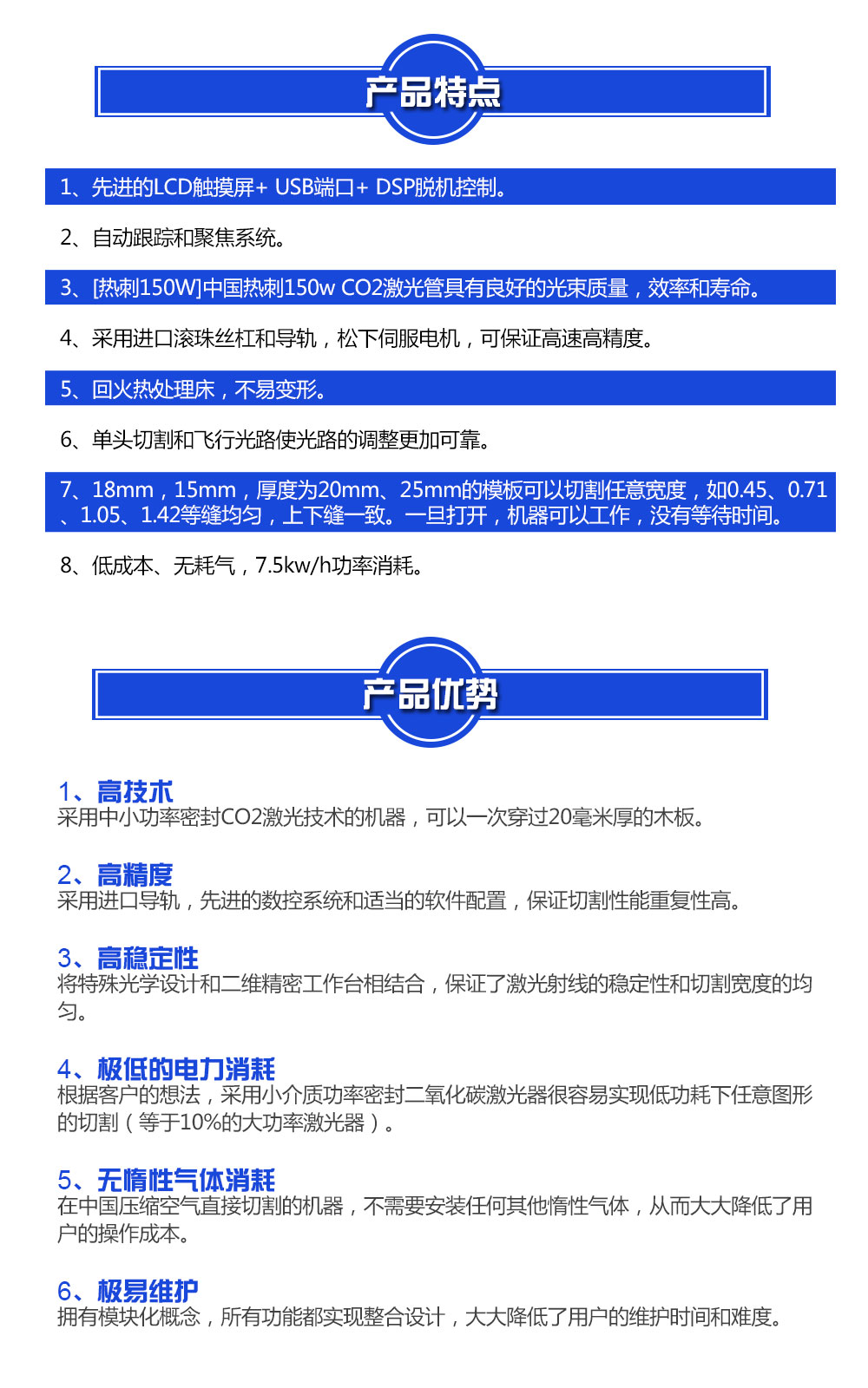 1.高科技:采用中小功(gōng)率密封二極管激光器,可一次(cì)切割20mm厚的木板,技術水平高。